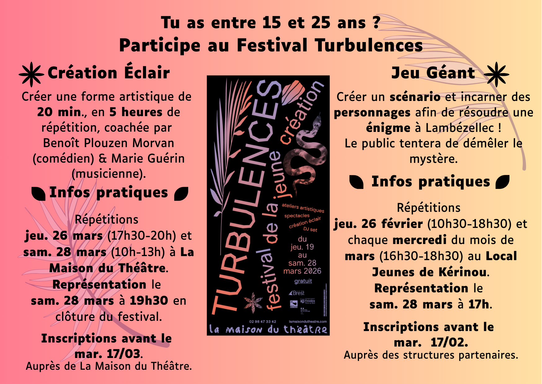 Et de 5 ! Turbulences, festival de la jeune création, rythme l’agenda de la pratique artistique des 15-25 ans. Accompagnées par Benoît Plouzen Morvan, artiste associé à cette édition 2026, elles se déploient du quartier de Lambézellec à la Rive droite, en médiathèques, collèges, lycées et FJT. On y vient à pied, à vélo, en tram ou en BHNS !